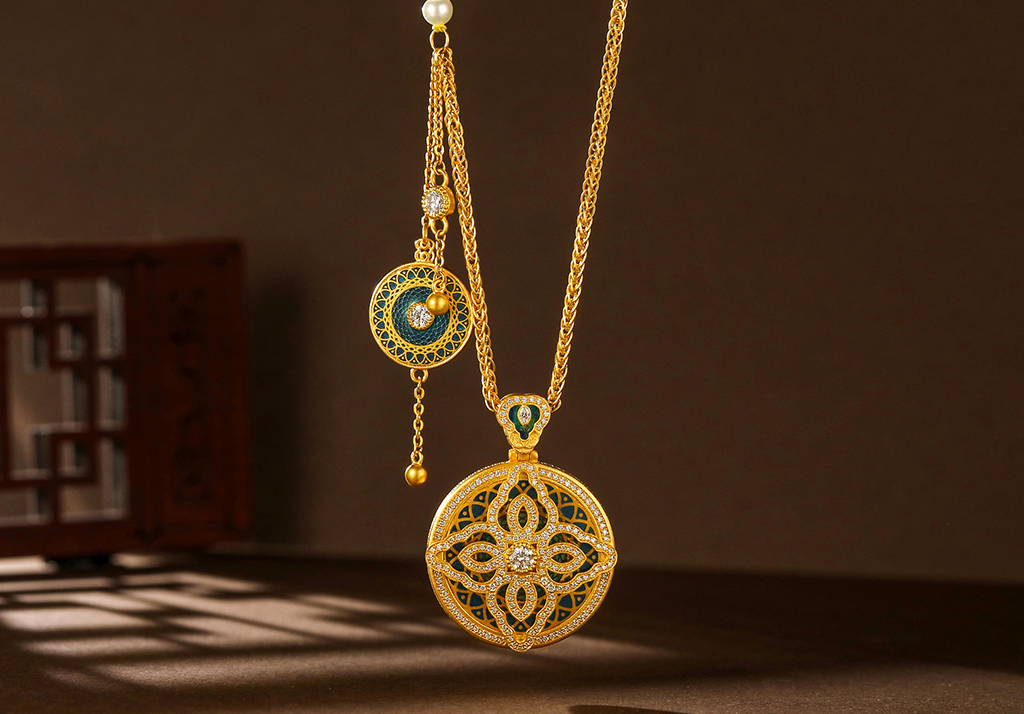 “当代宝相”系列产品以敦煌壁画中的藻井为设计元素,以黄金、钻石、珐琅、大漆、螺钿为材质,色调和谐清雅,构图巧妙别致,像是从人间直通天宇的一方窗口,承载着古人独特的浪漫情怀。